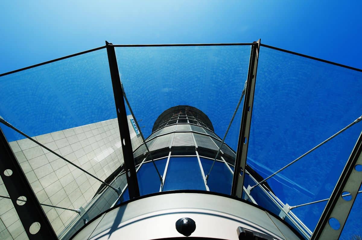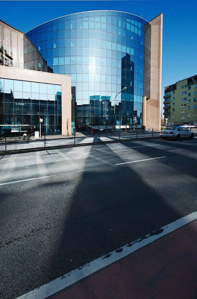 Aufgrund der nahe gelegenen Straße waren die Scheiben der Fassade des RWE-Gebäudes mit Staub bedeckt, den ich mit Hilfe von GIMP ein wenig gemildert habe.